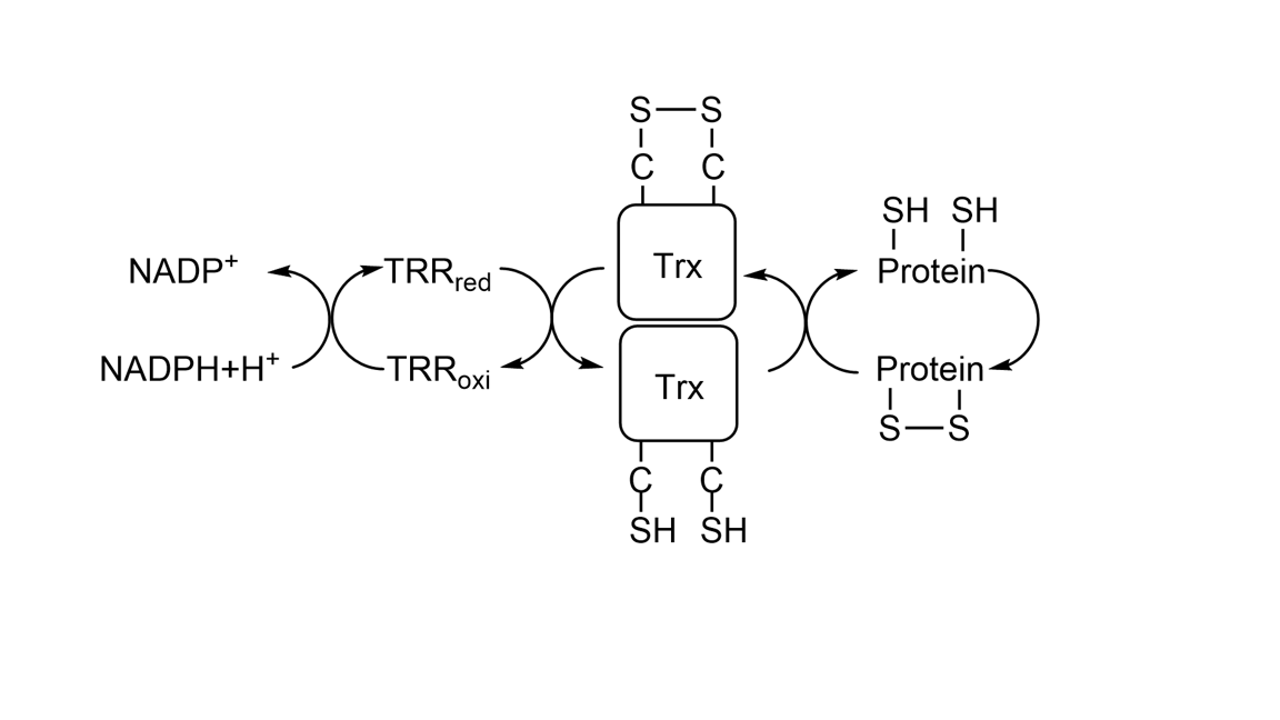 Thioredoxin System. Thioredoxin(Trx) reduces a large number of proteins and gets oxidized in the process. After it, Thioredoxin Reductase(TRR) reduces Trx, which is reduced by NADPH in the end.